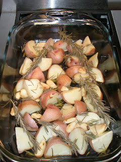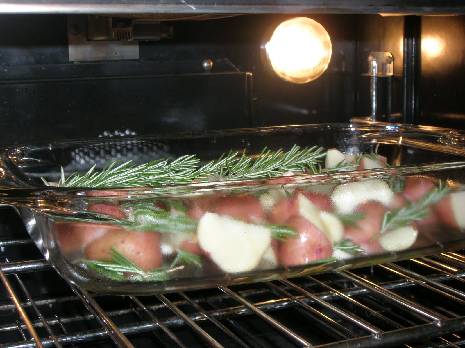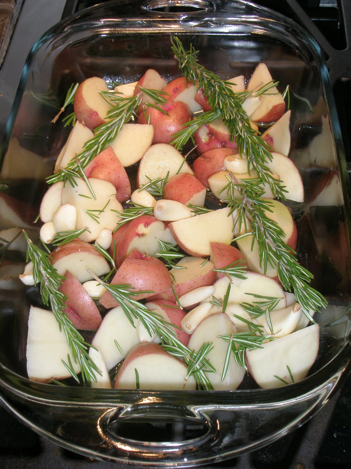 • Spray a glass brownie dish with EVOO and add in the potatoes. Drizzle with EVOO (you don’t want to completely coat them, just sprinkle the bottle across the dish.) Add in the garlic cloves, rosemary sprigs (smell AMAZING!) and lightly sprinkle with salt.