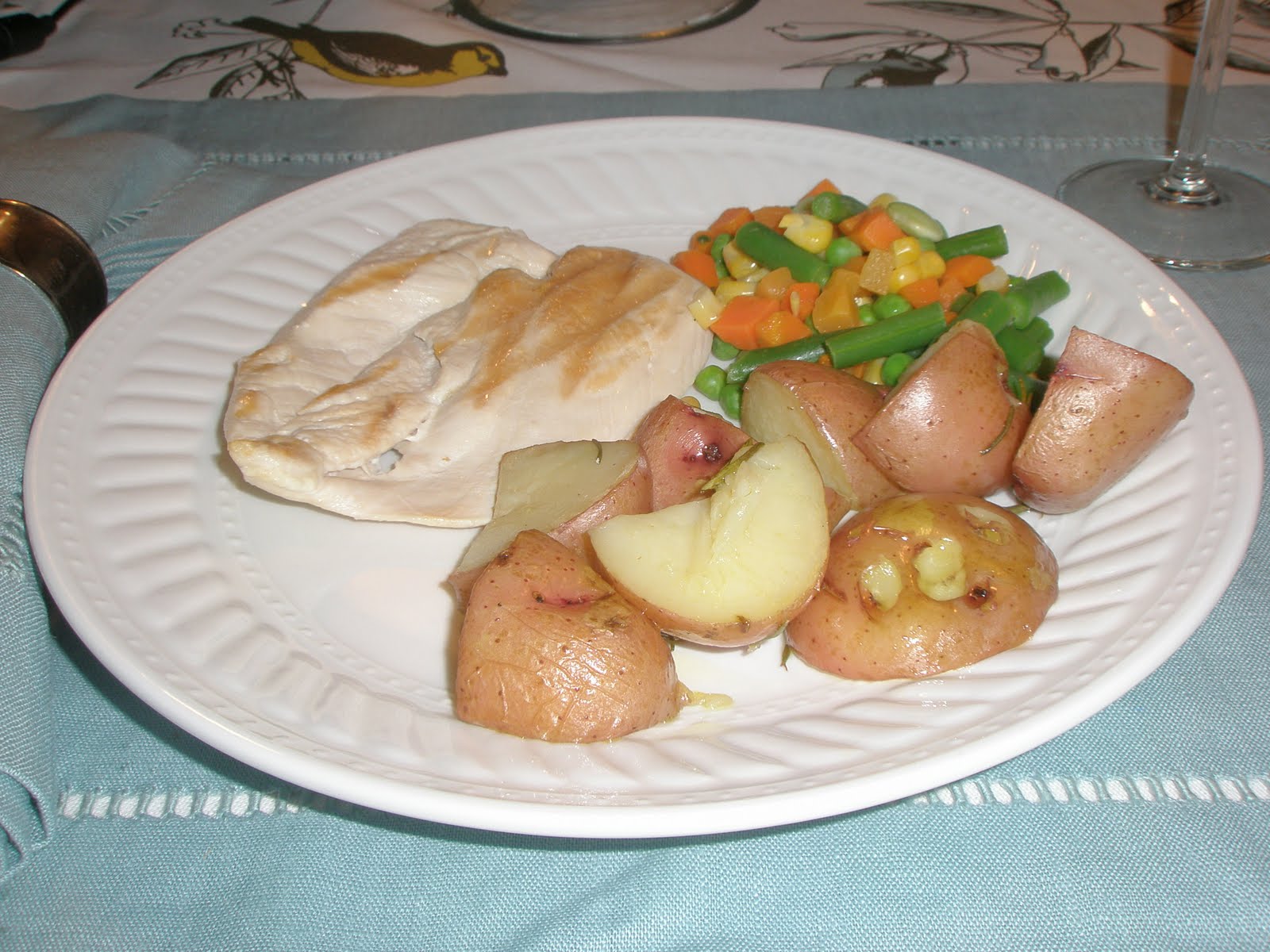 Lastly, (yes, FINALLY already! That quick!) serve with a chicken breast that you can grill in five minutes and steamed veggies you zap in the microwave for 3 minutes. TAAA-DAAAA!!!! Isn’t that cooking magic just abSPUDlutely amazing?!!? 🙂