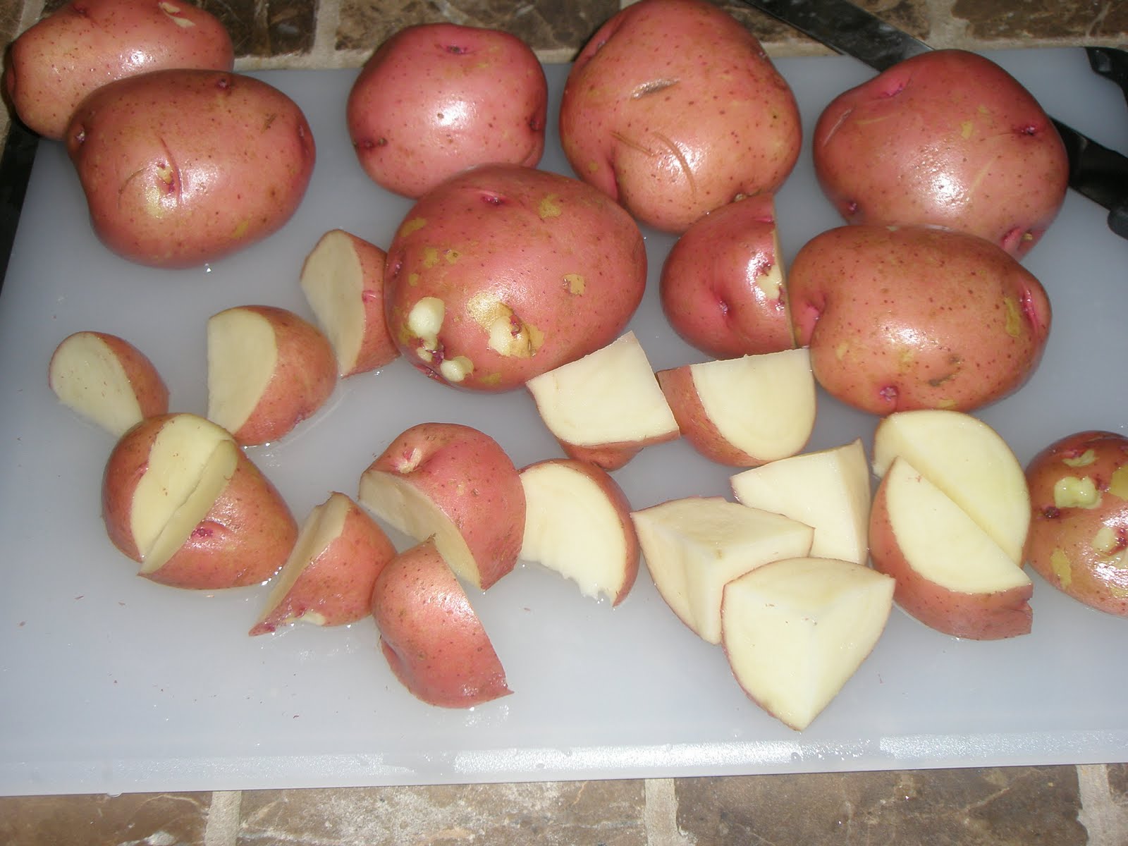 • Next, cut the potatoes into halves and then cut the halves into thirds.