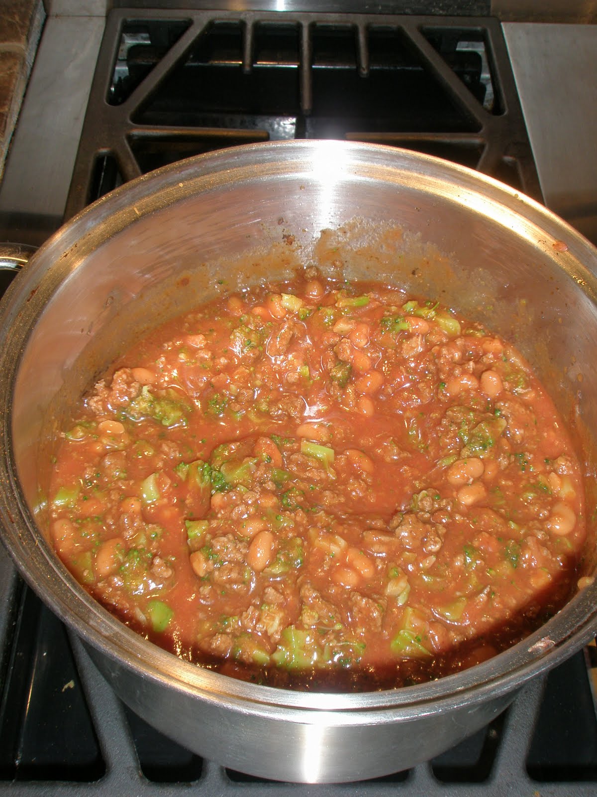 Once the meat is fully cooked, add the tomato sauce, baked beans and chopped broccoli.