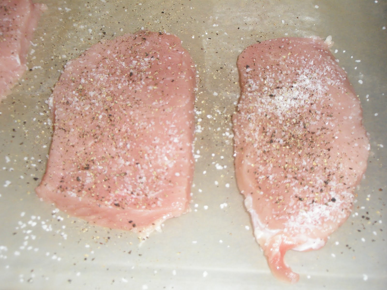 Line a thick cutting board with wax/parchment paper. Then stagger your four pieces of pork.