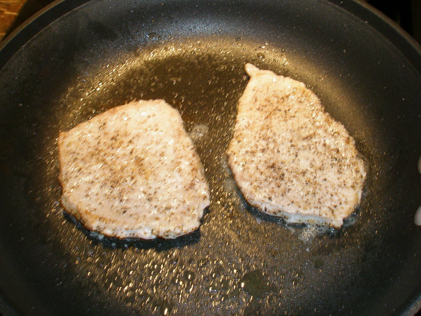 - Spray a pan with EVOO and put on medium heat. Cook two pork chops at a time for about 3 minutes on each side.