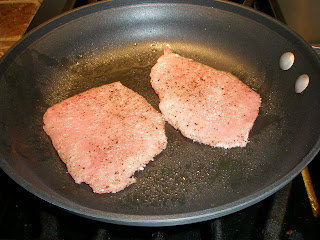 Spray a pan with EVOO and put on medium heat. Cook two pork chops at a time for about 3 minutes on each side.
