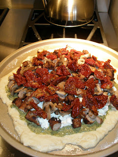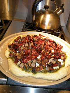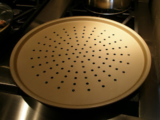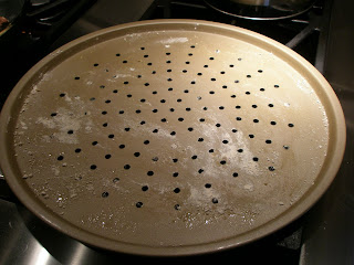 I bought this fabulous pizza crisper when I got overly excited about cooking on a trip to Williams-Sonoma back in January. I have yet to use it! Tonight I finally christened it and made some l’italiana pizza. (Mi piace scrivere questo nell’italiano ma nessuno capisce.)