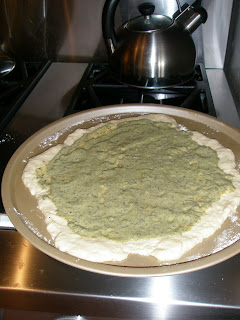 - Spoon and evenly spread pesto sauce on the pizza dough. Use a thin layer to prevent soggy crust.