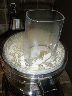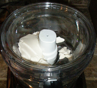 Then put the hot tofu into the small bowl of your food processor using the small blade. Leave on until the tofu is a smooth white.