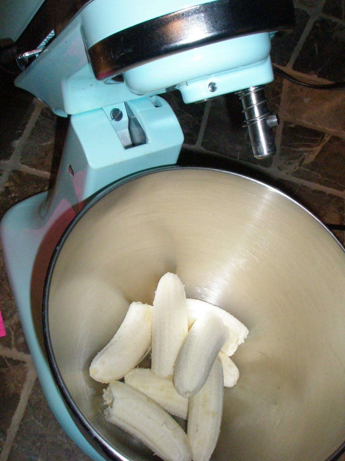 Use the mixer’s flat beater to combine all ingredients. First set on stir and then gradually increase the speed. Mix until the batter is liquefied but you can still see banana chunks.