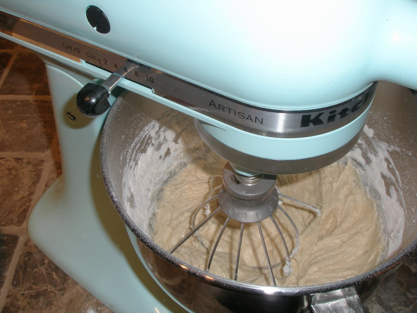 Next add the dry ingredients into the mixer mixing bowl with the brown sugar mixture. Add in the yogurt, eggs and vanilla. Mix on high for about three to four minutes using the whip attachment – you’ll want to add in air to keep this light and moist.