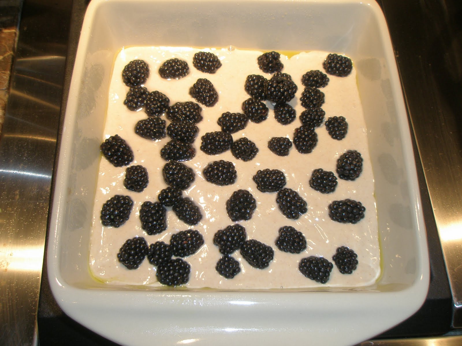 - Add half the batter to an 8 inch square pan, sprayed with EVOO, of course! Add in all the blackberries – spread them out so that each bite of cake will have some blackberry! (Also, this trick prevents your batter from turning a blue/purple/red color when the berry juice bleeds.) Cover the blackberries with the remaining batter. You may have to use a spoon to spread the batter.