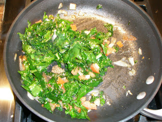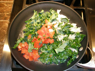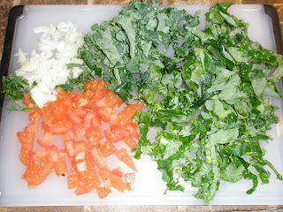 Wash and dry the tomato and kale. You may have to go through quite a few paper towels to remove all the water. Then slice away alla Iron Chef! Just slice the kale leaves into strips, chop the tomato into small cubes and onion into thin pieces.