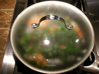 After three minutes, cover and put on low heat. Then uncover and turn off heat when the pasta timer goes off.