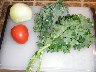 • Wash and dry the tomato and kale. You may have to go through quite a few paper towels to remove all the water. Then slice away alla Iron Chef! Just slice the kale leaves into strips, chop the tomato into small cubes and onion into thin pieces.