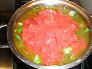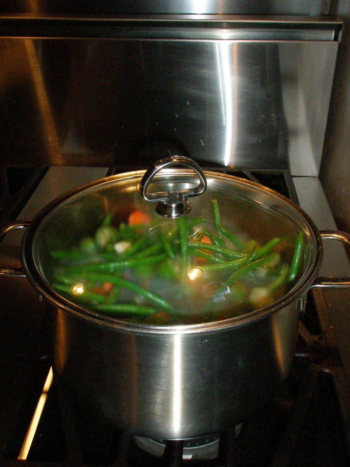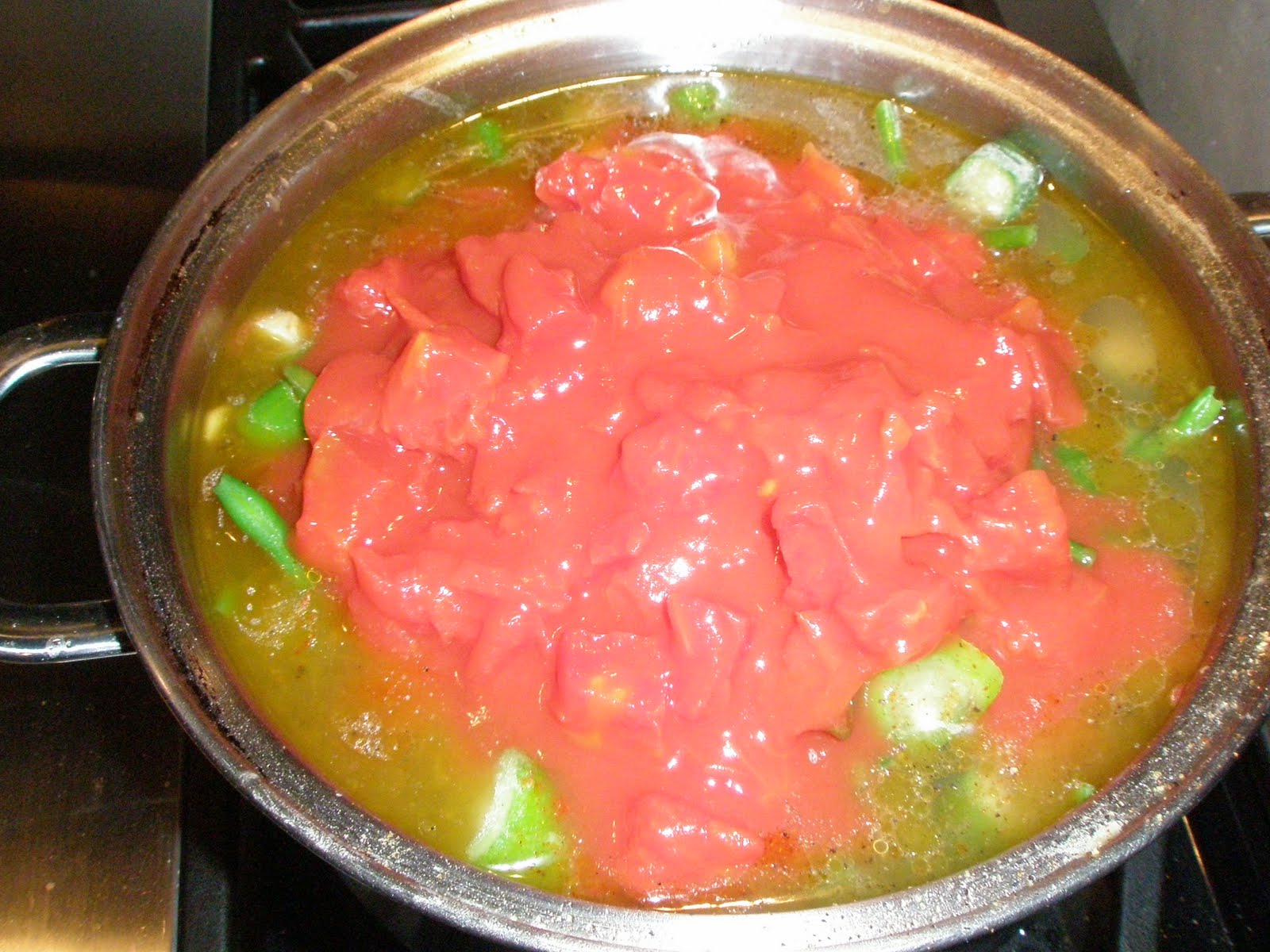 - Next add in the water and remaining veggies — carrots, green beans, okra, parsnip and diced tomatoes.