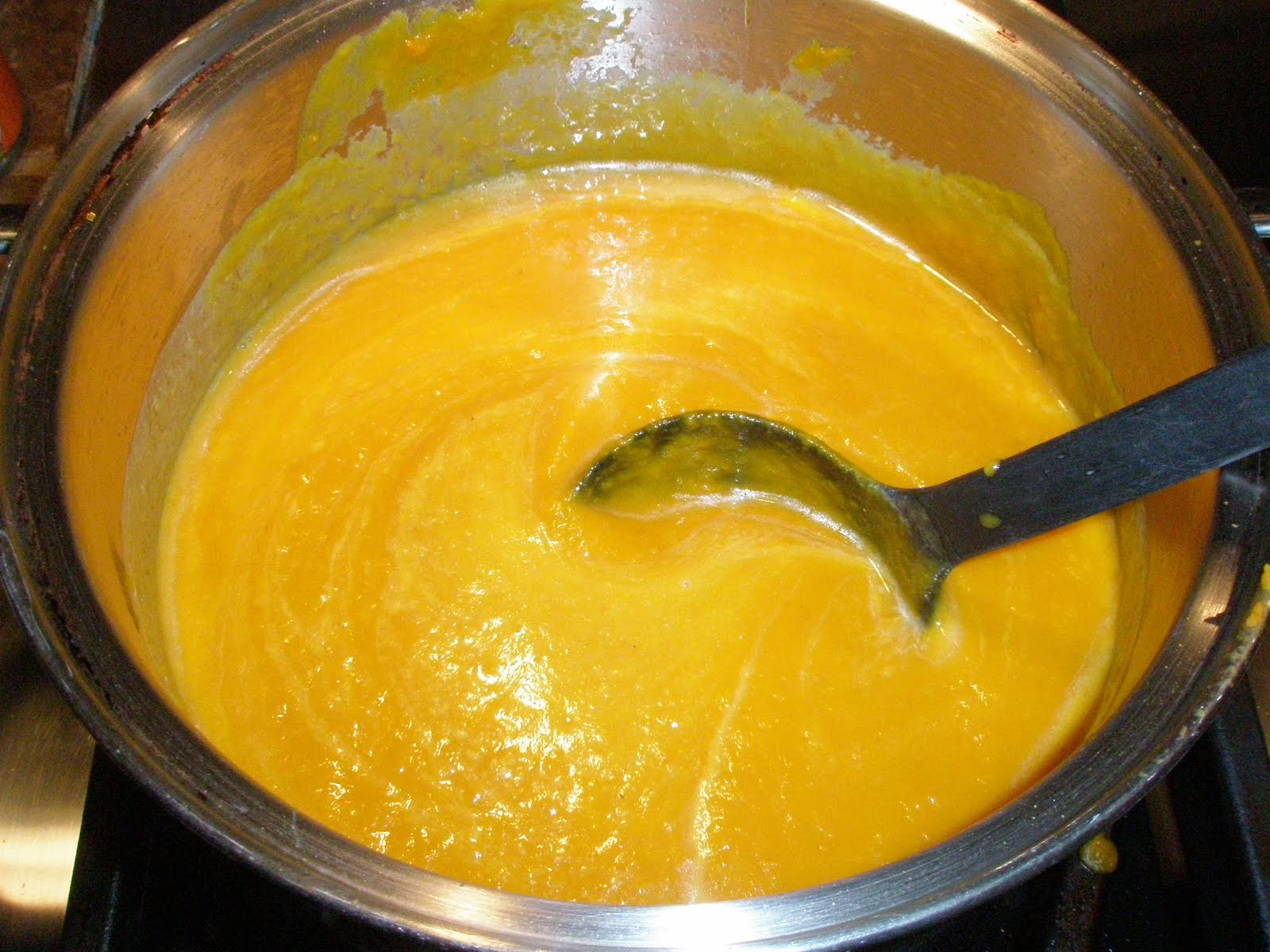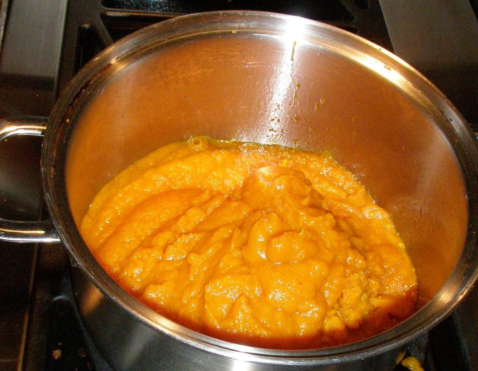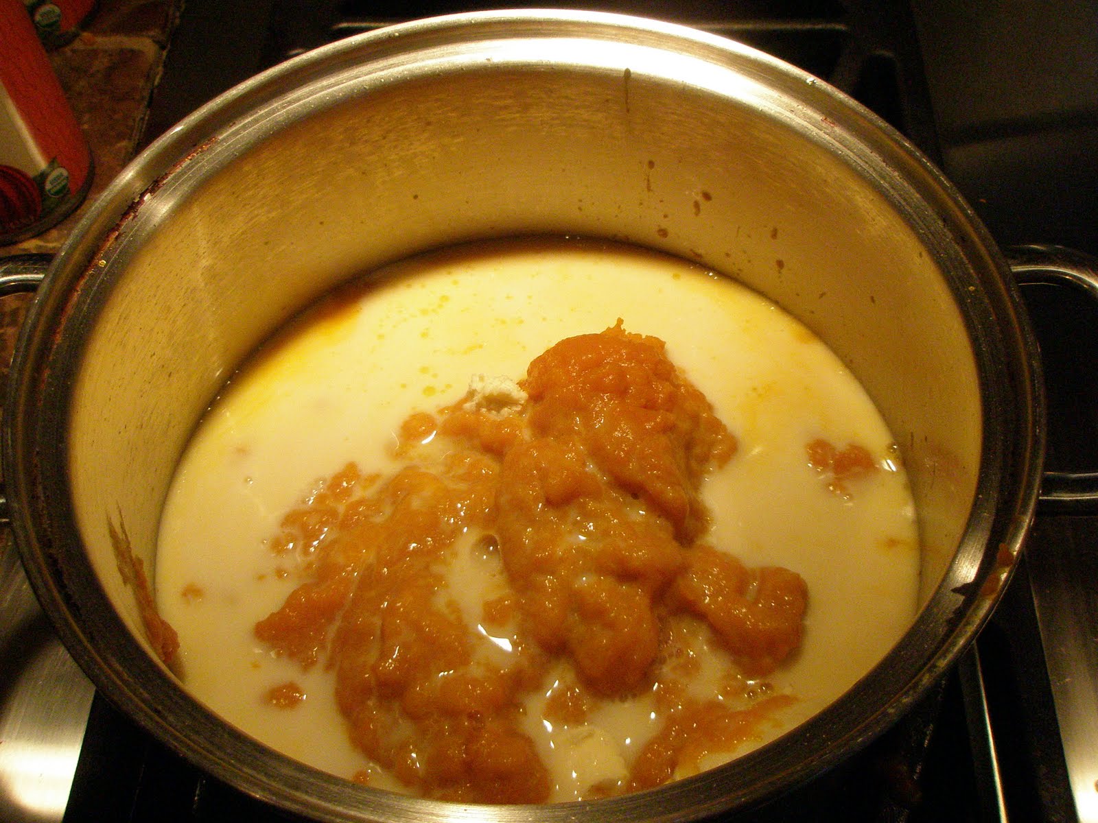 - Spray soup pot with EVOO and place on medium heat. When you can see the pot is hot (the oil will start bubbling), add in the pumpkin. Next, immediately add in the almond milk and butter. Stir to combine all ingredients.