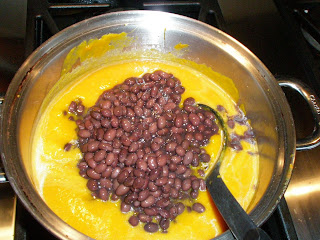 - Add the two cans of drained black beans into the pumpkin soup. Stir until all ingredients are combined.