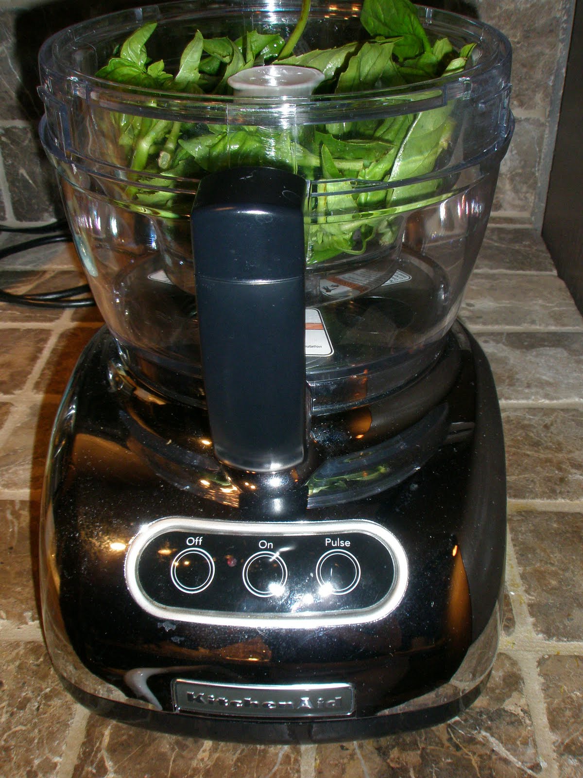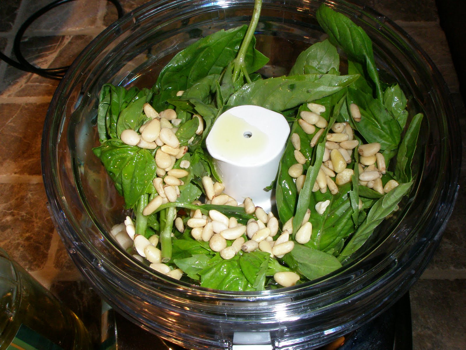 - Using the small bowl in your food processor, add in the basil leaves, pine nuts, EVOO and garlic.