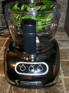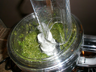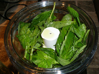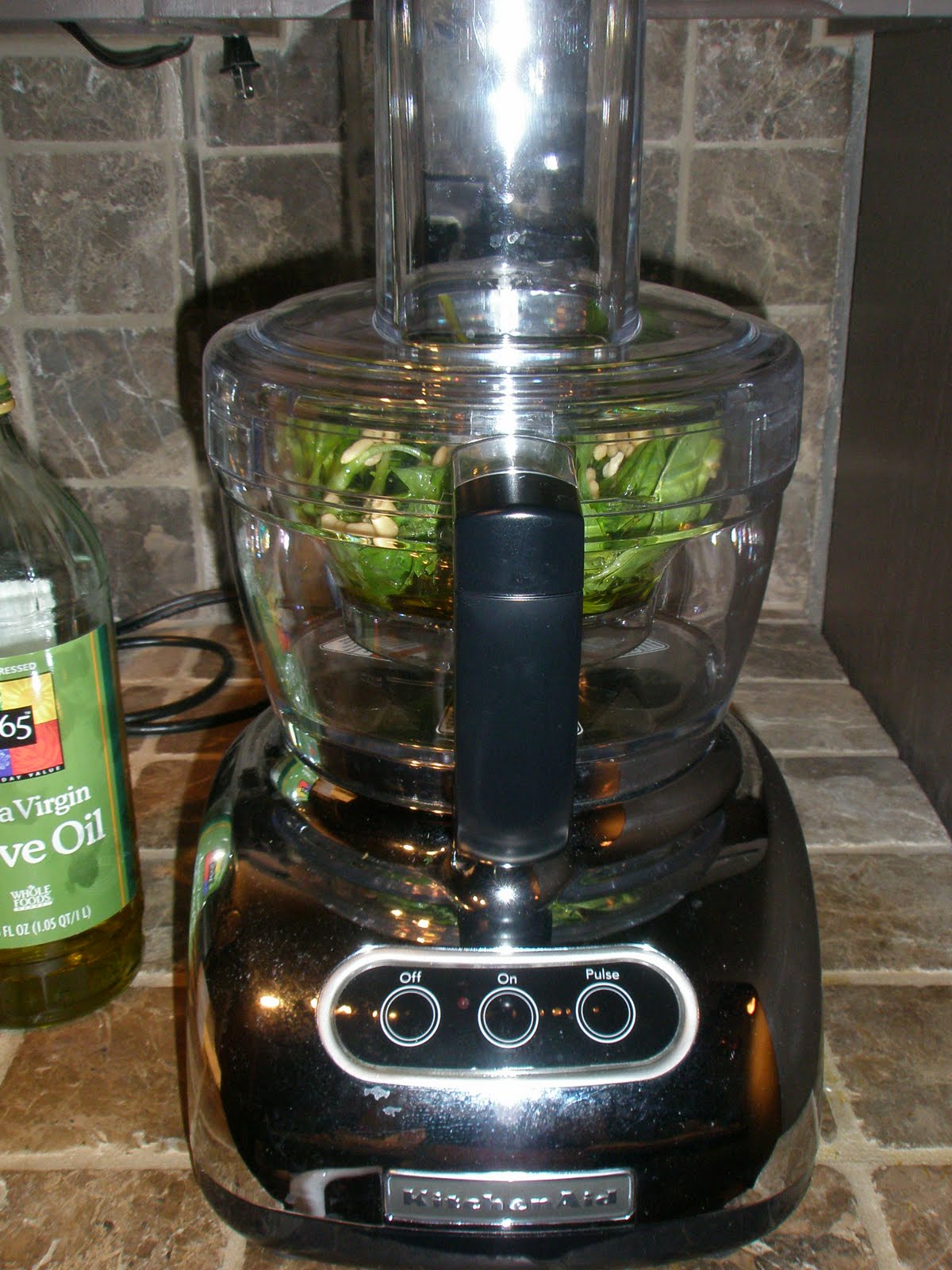 Using the small bowl in your food processor, add in the basil leaves, pine nuts, EVOO and garlic.