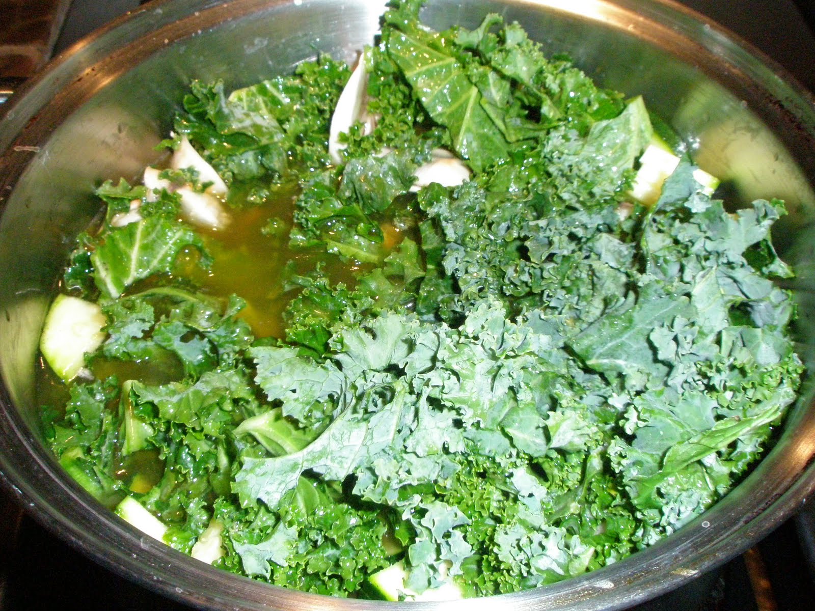 First, chop all your veggies — onion, mushrooms, kale and zucchini. This will make everything go much faster and leaves some time for an Irish jig!