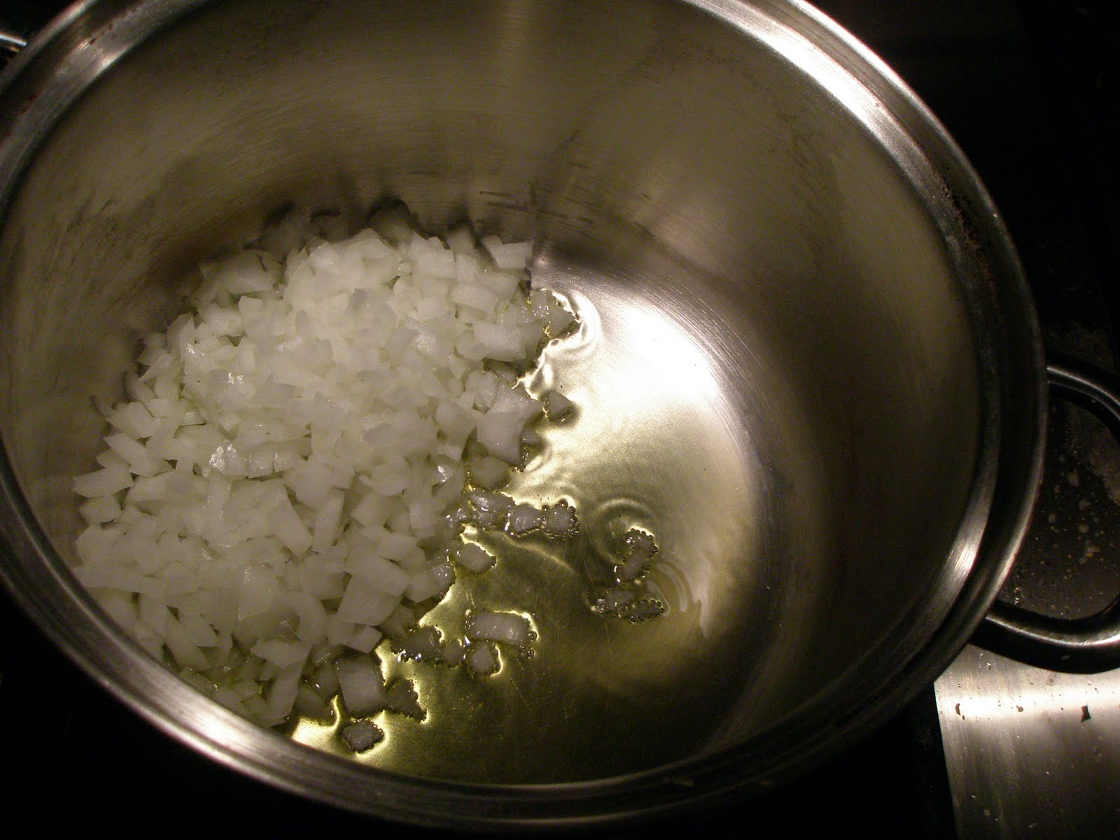 • Next, heat a soup pot on medium heat. Coat the bottom of the pan with the EVOO and add in the onions. Coat the onions with the oil and cook for approximately 4 minutes.