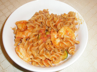 - Once the water in your large pot is boiling add the pasta and set a time for eight minutes. Then add the sauce to your pan with the shrimp and veggies. Coat everything with the pasta sauce and cover on medium heat. Be sure to stir after four minutes so that the shrimp cooks evenly.