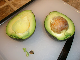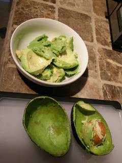 - Slice avocado in half and remove the pit. Use a spoon and scoop out the avocado into a small bowl.