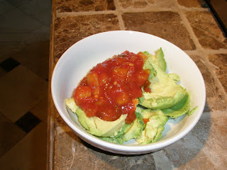 Then add the two tablespoons of mango peach salsa to the bowl with avocado. Use a masher or spoon to soften avocado and mix with the salsa.