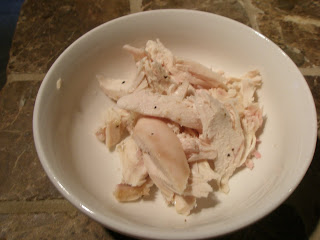 Take your rotisserie chicken and shred the meat you best enjoy eating- I only like white meat so I just use the breasts. Shred it into a bowl and heat in the microwave for 20 seconds, if previously purchased.