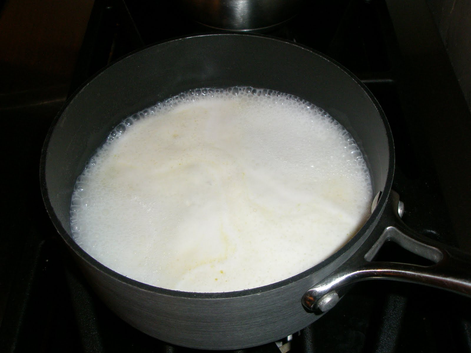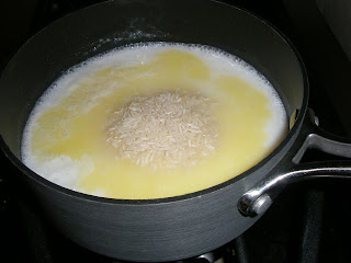 The most labor intensive portion of this dinner is making the rice, so here goes! Add the coconut milk, water and Earth Balance to a soup pot and let boil.