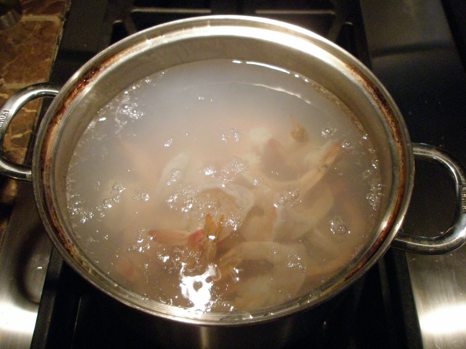 Add water to a large stock pot and let boil. Once boiling, add the shrimp and let boil until the shrimp turns pink and curls in- approximately 2-3 minutes.