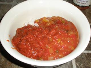 • Add the entire jar of peach salsa and the half bottle of cocktail sauce to the bowl of shrimp. Slice the lime in half and squeeze in some juice. Mix all ingredients together.