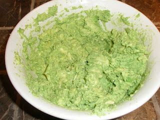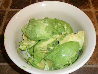 First, peel and pit your avocados. I found the trick to peeling is cut them in halves and use a spoon to separate the skin and inside without making a mess. Mash them in a small mixing bowl to make the guac!