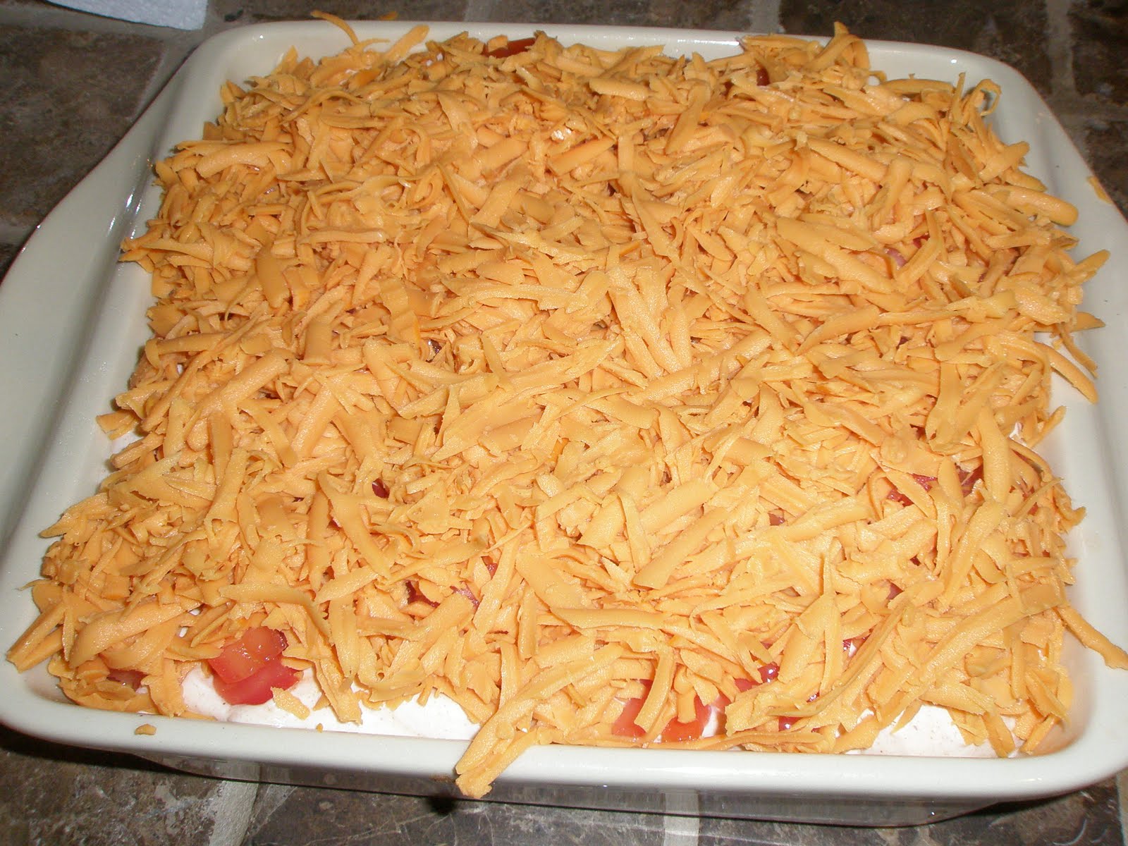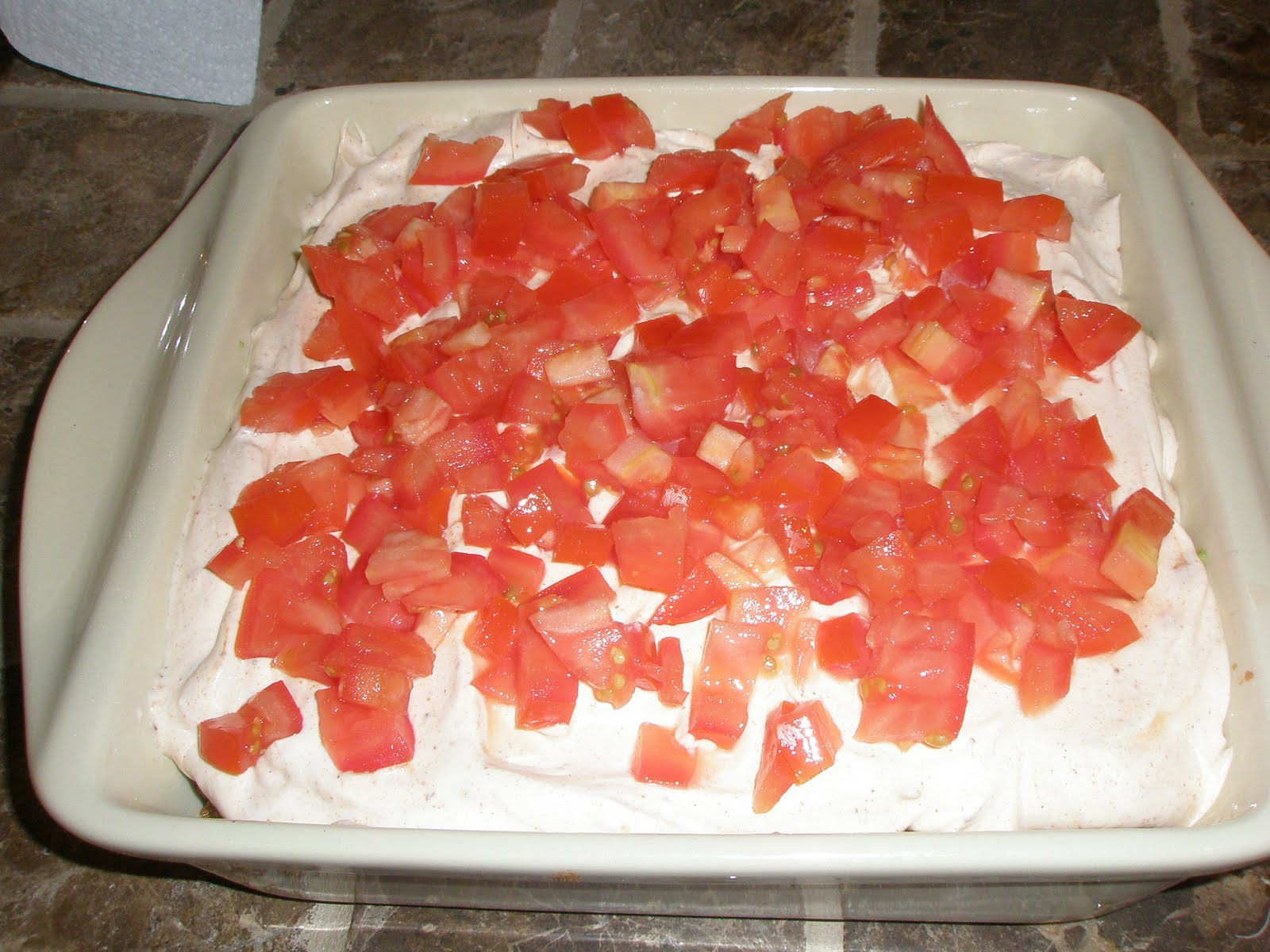 • Finish off the dip by topping with tomatoes and the shredded cheese.
