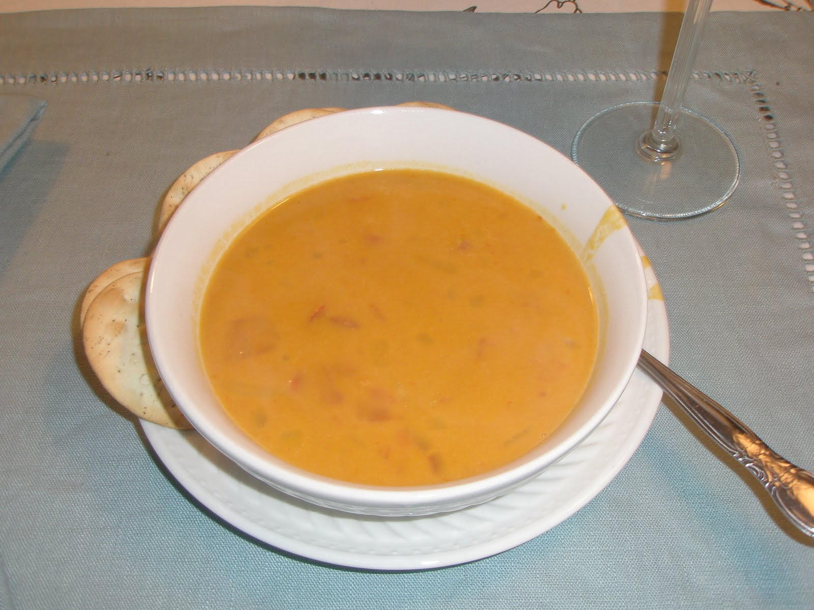 Then serve with some table water crackers — crumble in the soup to help absorb the spicy flavor from the cayenne pepper and curry powder. Enjoy on a chilly afternoon or night with a glass of chardonnay!