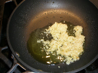 While you wait, add the EVOO and garlic into a pan and let it set for three minutes on medium. Once the time is up, set aside. Be careful, the oil will spatter a bit so use a screen to prevent being burned.