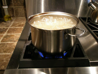 Add the potato chunks to the boiling water and leave boiling for 25 minutes. (My method for now is standing back and throwing them into the pot which sprays boiling water all over my range. I’m open to any suggestions or more successful techniques!)