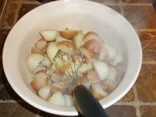 - Drain the potatoes and add into a mixing bowl. Then mash them! (I have not yet expanded my culinary tools so I channeled my inner Girl Scout and used a whisk as a masher. Resourceful, eh?)