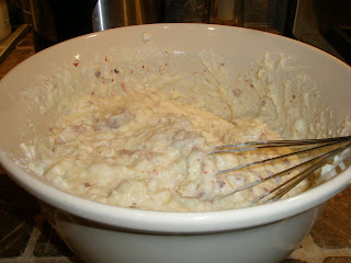 Add the half and half, butter, half the grated cheese, cream cheese, garlic and crushed red pepper to your liking. Mix until it looks all combined. I like to keep mine kind of lumpy for the added texture.
