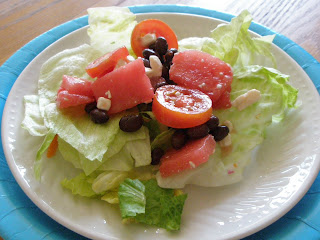 Gently combine all ingredients in the mixing bowl. I used my salad tossers to simplify the stirring and keep my watermelon and tomato slices in tact. Doesn’t it look so colorful and delicious?!!?