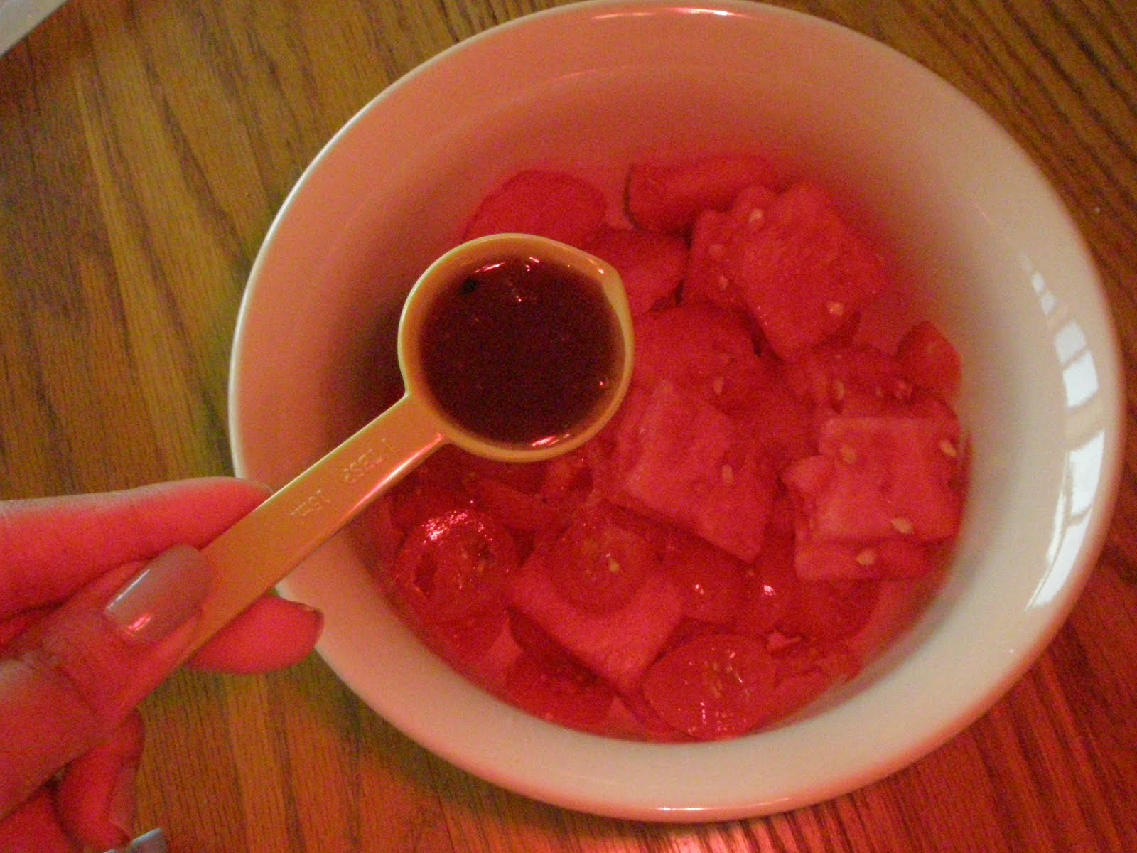 Add in the tablespoon of dressing and the pinch of salt. The dressing helps bring out the subtle sweetness of the watermelon and tomatoes.