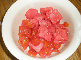 Combine the sliced cherry tomatoes and watermelon into a small mixing bowl.